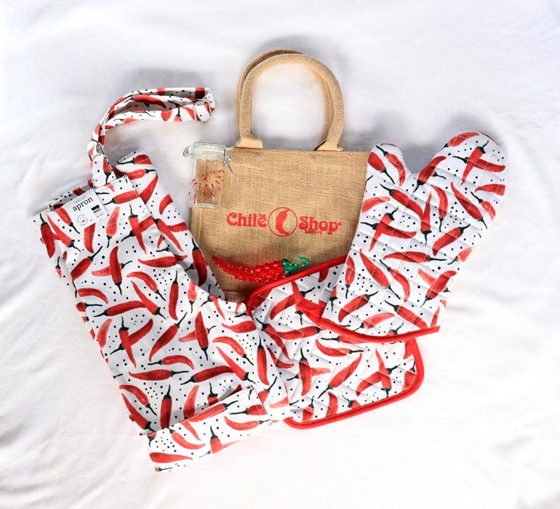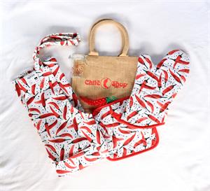 Our burlap gift bag comes with a chile pepper apron, chile pepper oven mitt, chile pepper hot pad, a hand-painted chile jar